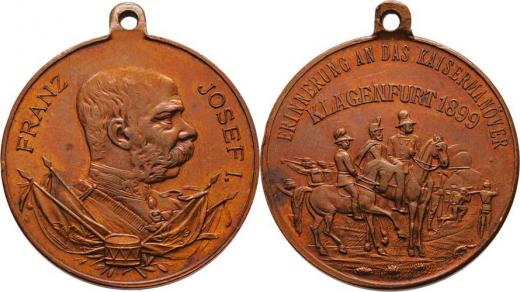 Klagenfurt 1899 - poprsí císaře Fr.Josefa zprava, něm.opis / důstojníci na koních, 2-řádkový něm.nápis, M-B.52, mosaz 29 mm s pův. raženým ouškem, dr.hr.