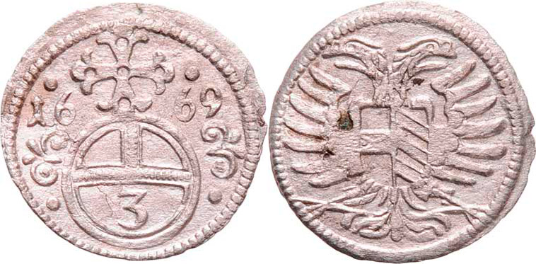 Grešle 1669, Opolí-Ehinger, MKČ.1684, Nech.856, T.9, 0.474g, mírně exc., mírně proh., skvrnka, patina