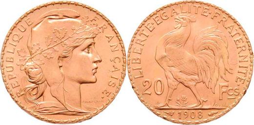 20 Frank 1908, Paříž, KM.857 (Au900), 6.438g, nep.hr., nep.rysky