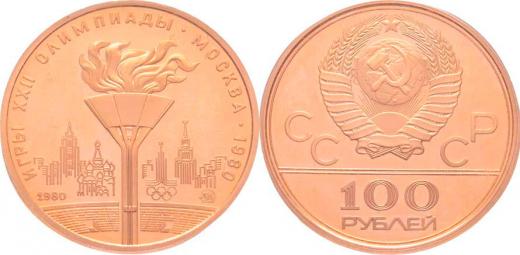 100 Rubl 1980 MMD - LOH - olympijská pochodeň, Y.186 Y.186 (Au900, 17.28g, náklad neuv.), skvrny, poškrábaná kapsle