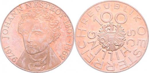 100 Šilink 1976 - Nestroy, KM.2932 (Ag640, 23.93g), nep.hr., vlas.rysky, patina