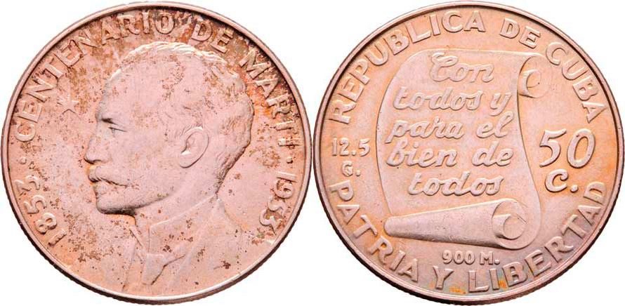 50 Centavos 1953 - Martí, KM.28 (Ag900), 12.482g, nep.hr., nep.rysky, pěkná patina