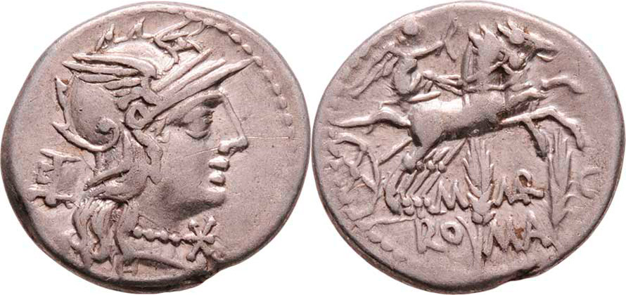 AR Denár, Hlava Romy, modius, zn."X." / Victoria na bize doprava, dva obilné klasy, nápis "M.MARC.ROMA.", Crawford.245/1, Seaby.Marcia.8, Alb.940, patina