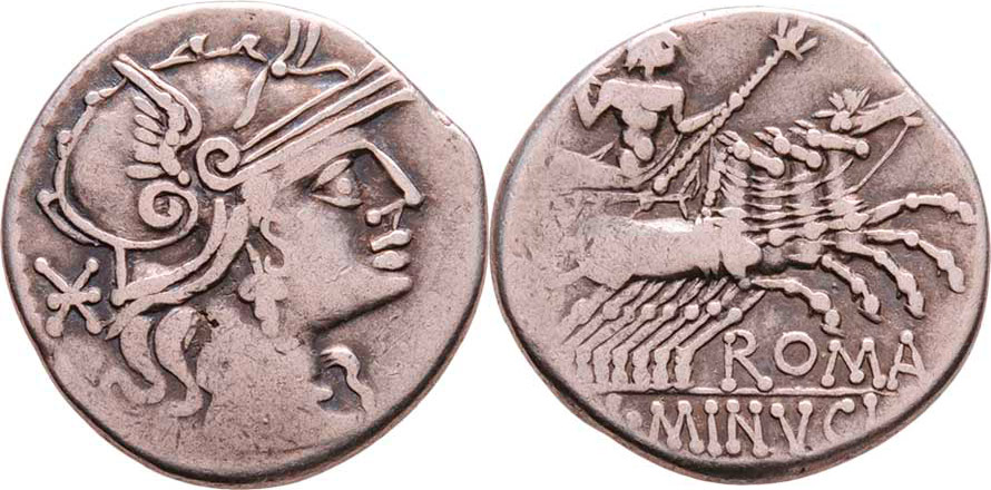 AR Denár, Hlava Romy zprava, značka "X."/ Jupiter na quadrize, nápis "ROMA.L.MINVCI.", Seaby.Minucia.1, Crawford.248/1, Alb.951, exc., nedor., patina