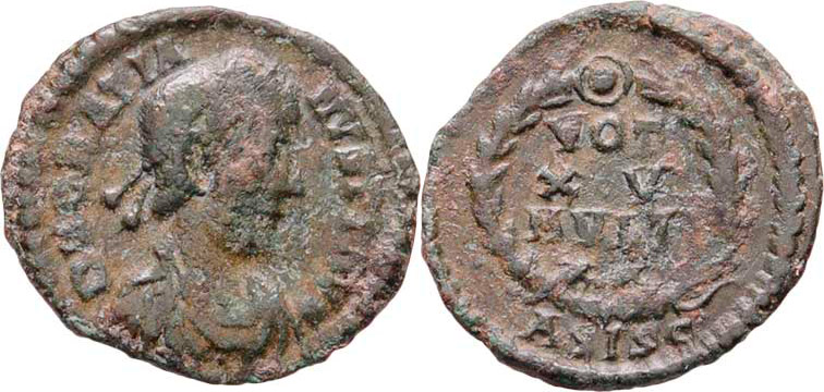 AE4, Rv:"VOT.XV.MVLT.XX." ve věnci, S.4045, RIC.31a - Siscia - 2.dílna - ražba z let 378 - 383, patina