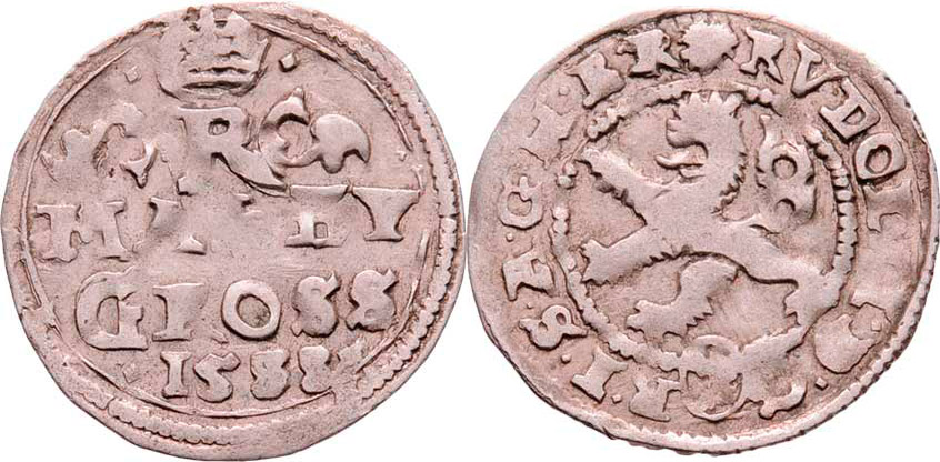 Malý groš 1588, K.Hora-Šatný, HN.3 (opis 7a), nápis " MALEY / GROSS /. 1588 .", 1.012g, nep.nedor., pěkná patina