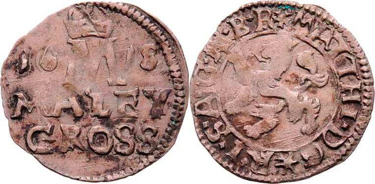 Malý groš 1618, K.Hora-Hölzl, HN.3a (opis 3a), nápis " 1618 / MALEY / GROSS ", 0.706g, nep.exc., nedor., patina