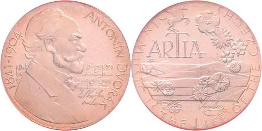 Antonín Dvořák - Artia - V hudbě život Čechů (1974) - poprsí zprava, notový zápis, opis / emblém, krajina, květiny, písmo, Sign., postř.bronz 38mm, k.145, etue