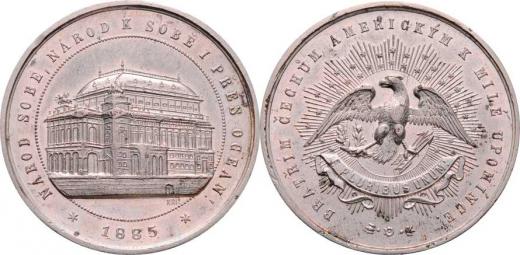 Praha - návštěva Čechů amerických 1885 - Národní divadlo, opis / americký orel s paprsky a hvězdami, opis, Sign., cín 37 mm, MZČ.164/24, skvrnky, patina
