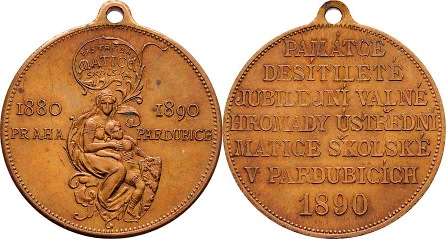 Jubilejní valná hromada matice školské 1890 - sedící matka s dítětem, nápisy / 7-řádkový nápis, Nesign., mosaz 30 mm s původním raženým ouškem, pěkná patina