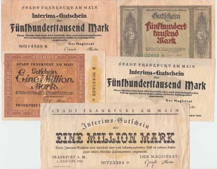 Frankfurt a.M. - 500 T Mark 1.8. (3 různé), 1 Mio Mark 1.8. (2 různé) 5ks