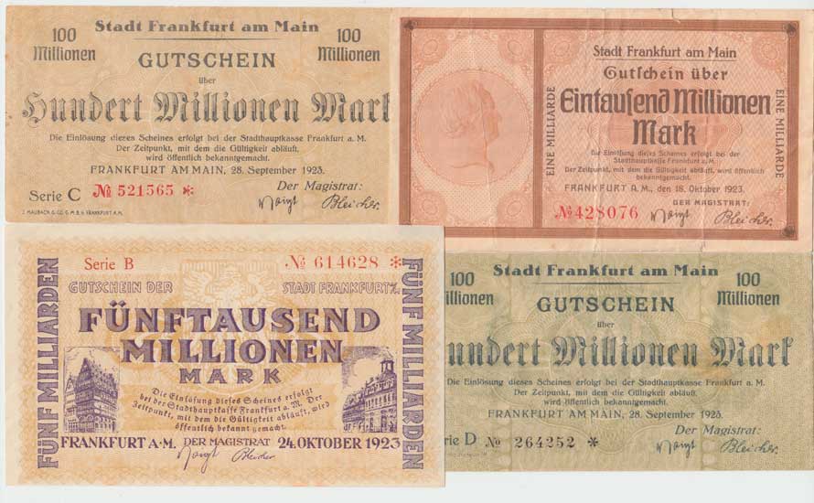 Frankfurt a.M. - 100 Mio Mark 28.9. (2 různé), 1000 Mio Mark 18.10., 5000 Mio Mark 24.10. 4ks