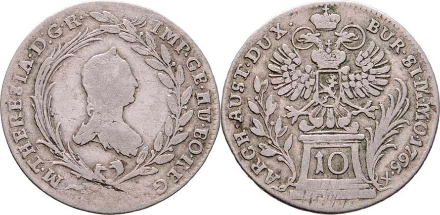 10 Krejcar 1765, Praha-Erdmann, N.33, MKČ.1961, 3.705g, dr.vady materiálu, mírně just., rysky, patina