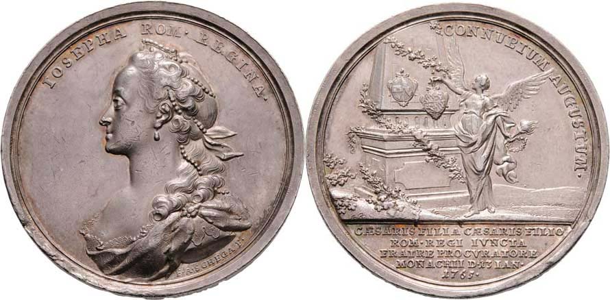 Schega - AR medaile na zasnoubení s Josefem II. 1765 - portrét zleva, opis / Hymen zdobí obelisk, písmo, Sign., Ag 46mm, 44.995g, M.1935, H.3133, dr.hr., rys.