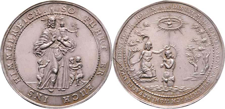 Buchheim ve Vratislavi (Sign.IB)- sv.Jan křtí Krista, Duch Svatý, opis / Kristus s dětmi, opis, b.l.(1645), Ag 40mm, 16.535g, m.o., vada razidla, nep.rysky R!