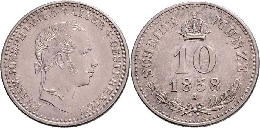 10 Krejcar 1858 A - větší a menší hlava, 1.995g, 2.025g, nep.hr., nep.rysky 2ks