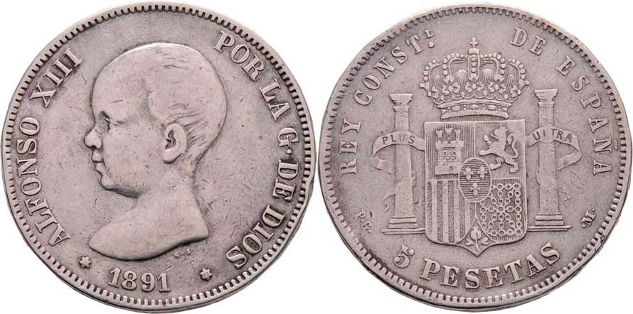 5 Peseta 1891/1891 PG-M, Madrid, KM.689 (Ag900), 24.560g, velké hrany, dr.rysky, patina