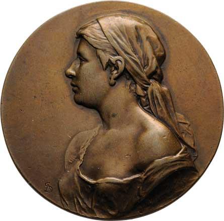 Portrét dívky zleva, bez opisů, b.l. (1901), Sign., patinovaný jednostranný bronz 43 mm, Bach.330