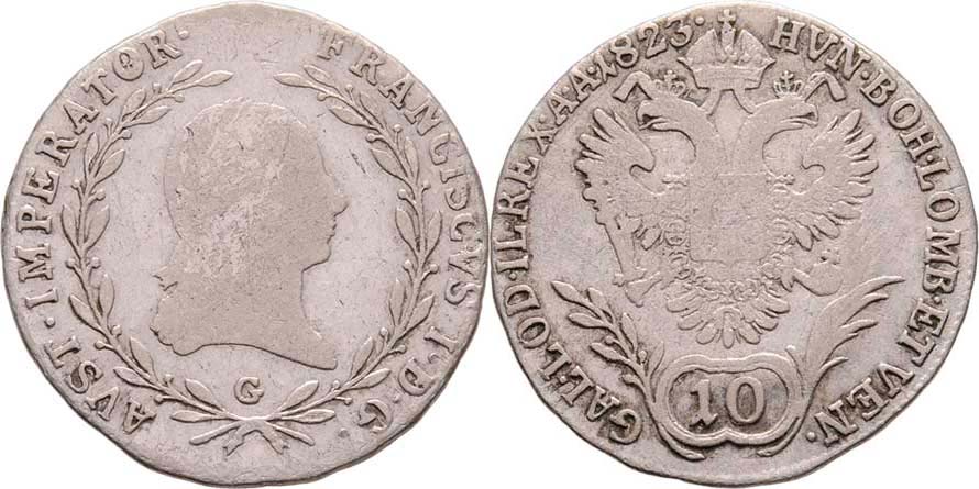 10 Krejcar 1823 G, Nagybanya, 3.607g, nep.hr.. nep.rysky, pěkná patina RR!