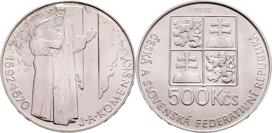 500 Kčs 1992 - Jan Amos Komenský, KM.158 (Ag900, 24.0g, 60.000 ks), patina