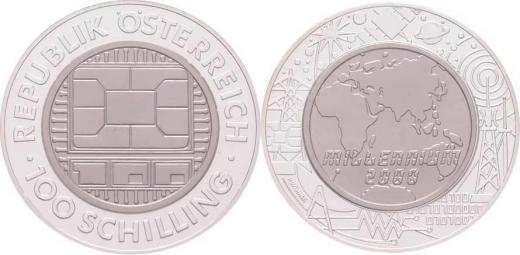 100 Šilink 2000 - Milenium - komunikace, KM.3073 (bimetal Ag/Ti, 13.6g, 50.000 ks), kapsle, etue, certifikát
