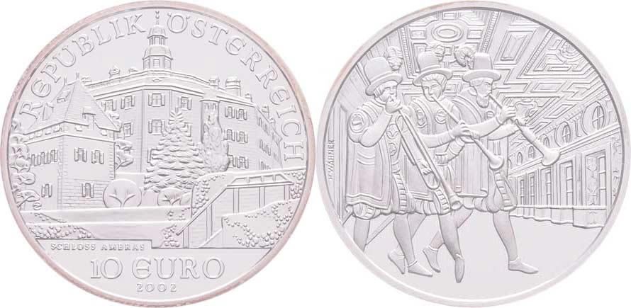 10 Euro 2002 - zámek Ambras - tři hudebníci, KM.3096 (Ag925, 17.30g, 50.000 ks), kapsle, etue