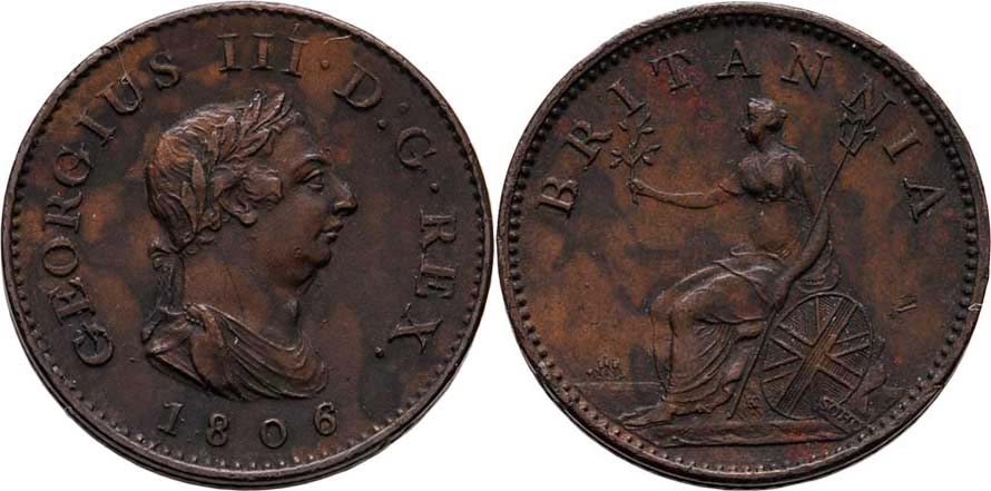 Fatrhing 1806, SCBC.3782, KM.661 (měď), hrana hladká s ornamentem do hloubky, 4.739g, nep.hr., patina