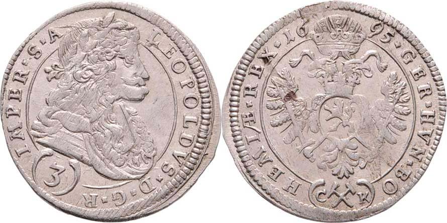 3 Krejcar 1695 CK, K.Hora-Krahe, Nech.314, MKČ.1458, 1.734g, válcovaný, nep.exc., nep.skvrnky RR!