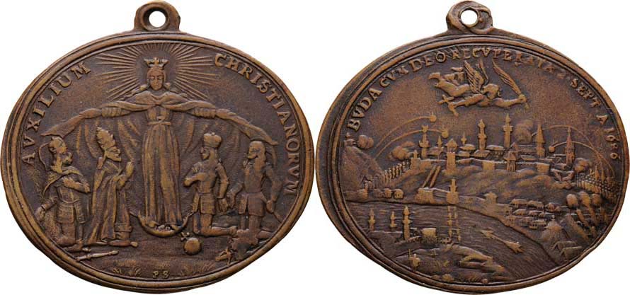 P.Seel - osvobození Budína od Turků 1686 - Madona a 4 klečící panovníci, opis / anděl nad obleženou Budou a nápis, Sign., AE 45/38 mm, 9.826g, M.1021, H.2126