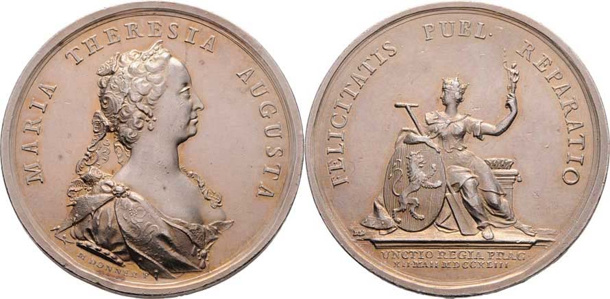 Donner - medaile na korunovaci v Praze 12.V.1743 - poprsí zprava, opis /sedící královna se opírá o český znak, písmo, Ag 44mm, 35.051g, ČS.1315, dr.hr.,dr.rys