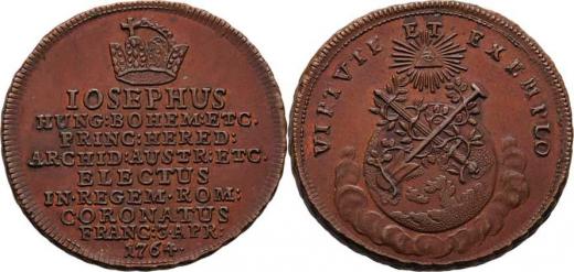 Větší peníz na korun. ve Frankfurtu 3.IV.1764 - Boží oko, meč a pluh na zeměkouli, opis / koruna a 9-řádk.nápis, měď 24mm, 7.626g, Nov.C.13c, patina RR!