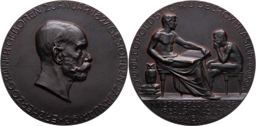 Schaefer - 50 let gymnasia v Leopoldstadu 1864/1914 - hlava zprava, opis/ učitel, žák a sova, opis a nápis, Sign., pat.bronz 60 mm, 102.735g, Haus.2700, patina