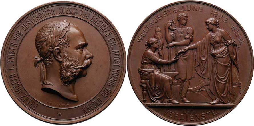 Tautenhayn - Světová výstava 1873 - DEM VERDIENSTE - portrét zprava, němec. opis / tři alegorické postavy, opis a nápis, Sign., měď 70 mm, Haus.2911, patina