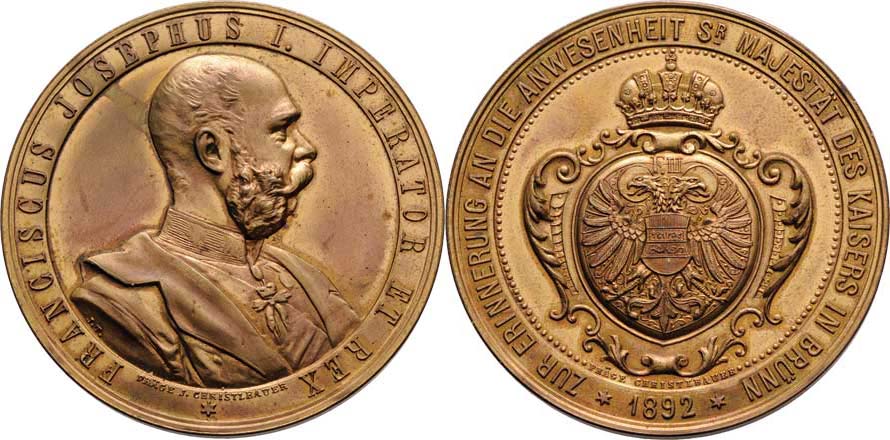Tautenhayn a Christlbauer - návštěva v Brně 1892 - poprsí zprava, latinský opis / korun. městský znak, německý opis, Sign., zlac.bronz 42 mm, skvrnky, pat.