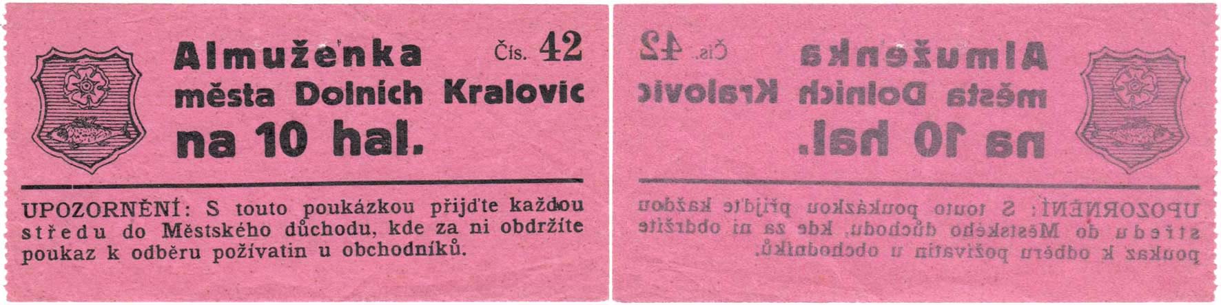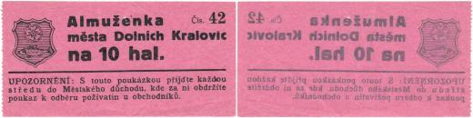 Dolní Kralovice - 10 Haléřů b.l. - čísl.42, růžový papír 106 x 53 mm