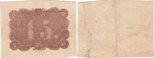 15 Krejcar 1849, jako Ri.411, jako Pick.S121, ale pouze hnědý podtisk aversu bankovky RR!