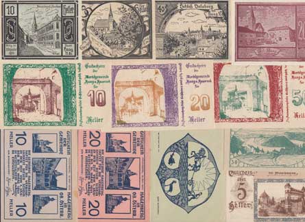 Sbírka rakouských nouzovek - města od písm. H,CH,I,J, celkem 242 ks (některé kusy vícekrát), převážně zach.