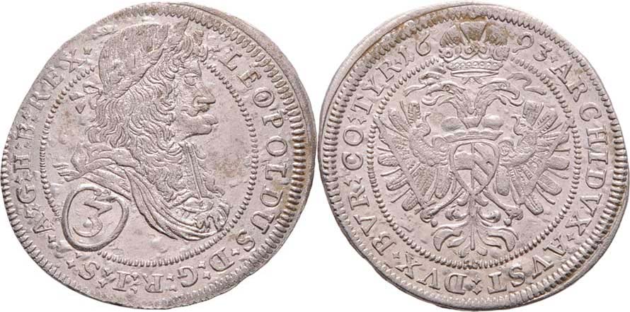 3 Krejcar 1693, Vídeň-Mittermayer, Nech.1974, M-A.192, 1.438g, oválný střížek, dr.vada razidla, nep.skvrnky