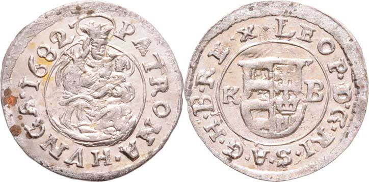 Denár 1682 KB, Kremnica, Nech.1286, Husz.1508, letopočet opraven v razidle (patrně z roku 1680), 0.570g, nep.skvrnky R!