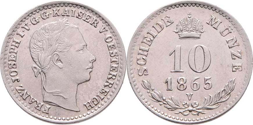 10 Krejcar 1865 V, 1.997g, nep.hr., vlas.rysky R!