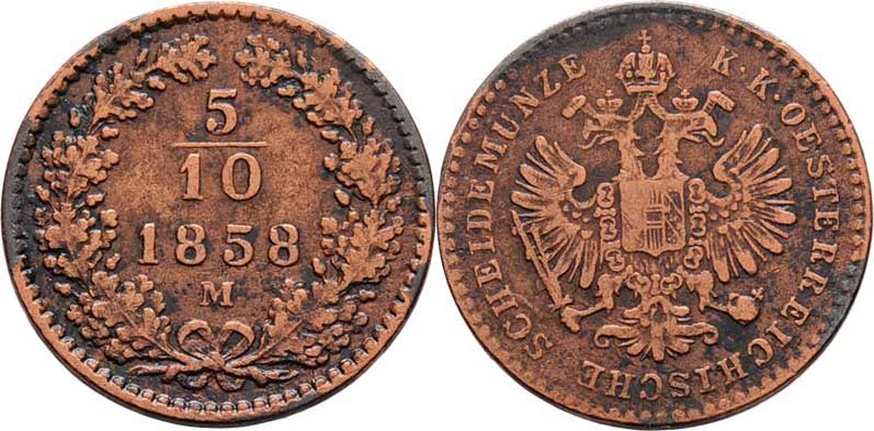 5/10 Krejcaru 1858 M, 1.620g, skvrny, patina R!