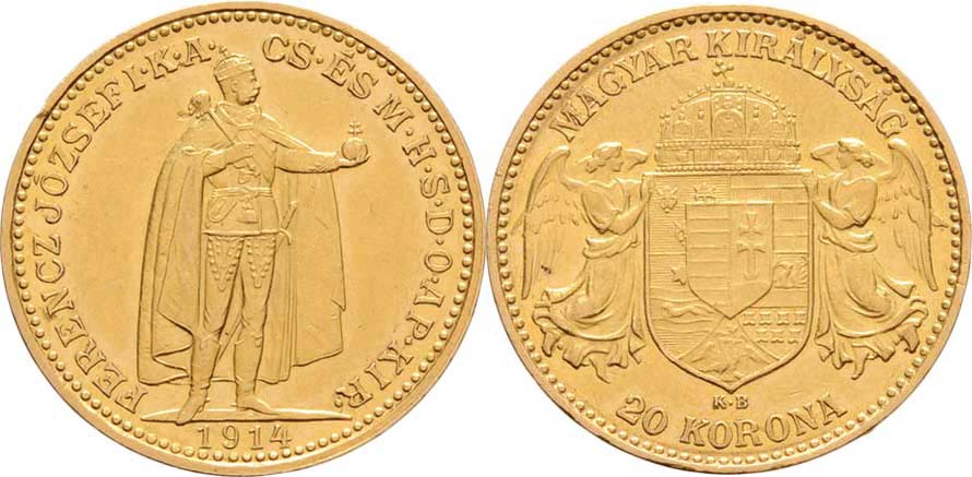 20 Koruna 1914 KB, 6.763g, hr., nep.rysky, téměř
