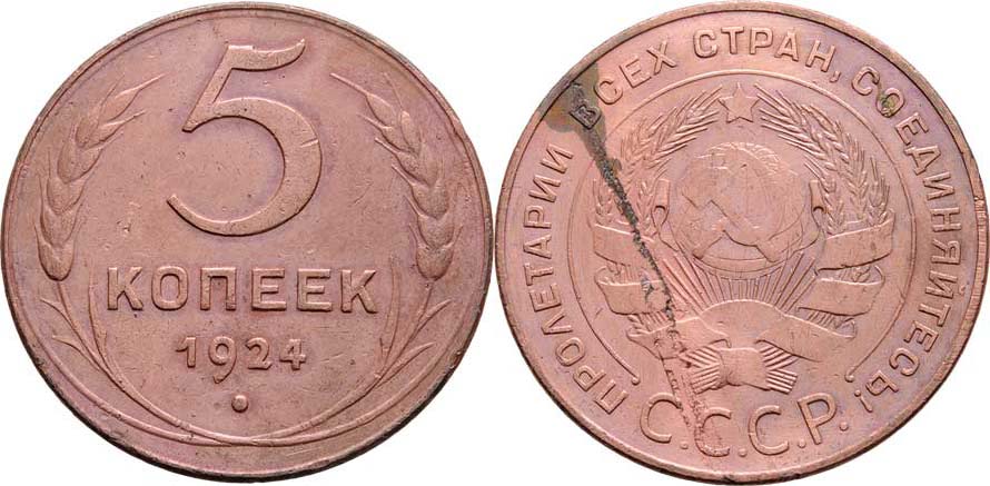 5 Kopějka 1924 - hladká hrana, Y.79, 16.458g, dr.hr., dr.rysky, vada materiálu, skvrnky