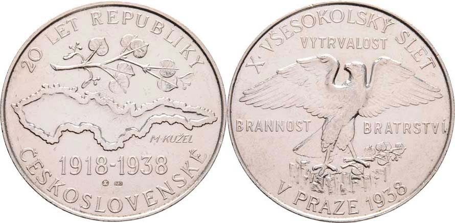 Praha - 20 let republiky a X.všesokolský slet 1938 - mapa republiky, lipová ratolest, písmo / sedící sokol a písmo, Sign., Ag987, 35mm, 13.995g, nep.rysky