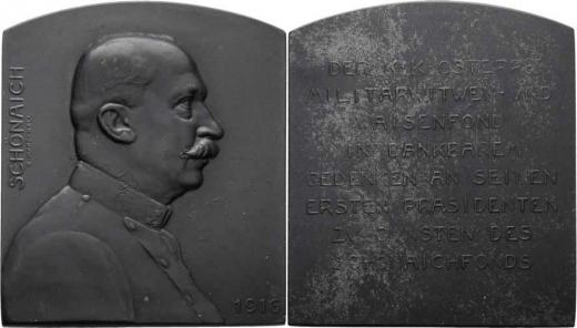 Fr.V.Schönaich, generálplukovník, ministr války 1916 - poprsí zprava, nápisy / osmiřádkový nápis, Sign., lakovaný patinovaný zinek 60x72 mm