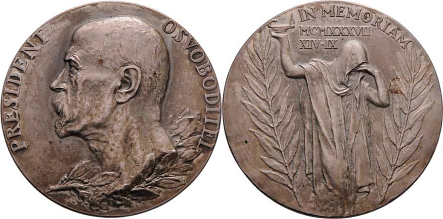Španiel - úmrtní medaile 1937 - poprsí zleva, vavřín. ratolest, opis / truchl.postava, palmy, nápis, Sign., Ag987, 60mm, 79.828g, Fl.54b, Nov1.1.135a, hr., rys.