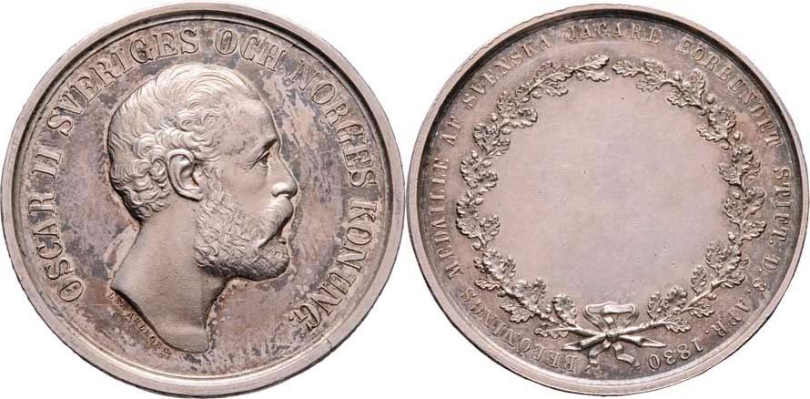 Oskar II. - záslužná medaile lovecké společnosti b.l. (založ.1830) - hlava zprava, opis/ místo pro udělení, věnec, opis, Sign.Lea Ahlborn, Ag 34mm, 16.853g, pat.