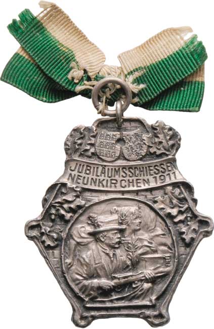 Neukirchen 1911 - šestiúhelníková plaketa se závěsem, Nesign., patrně stříbrný plech 40x45 mm v reversu vyplněný cínem, zelenobílá stuha R!