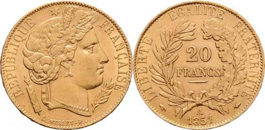 20 Frank 1851 A, Paříž, KM.762 (Au900), 6.422g, nep.hr., nep.rysky, pěkná patina, téměř