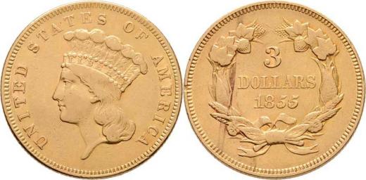 3 Dolar 1855 - hlava indiána, KM.84 (Au900, pouze 50.555 ks), 4.991g, dr.hr., dr.rysky, nep.zvlněný, pěkná patina RR!